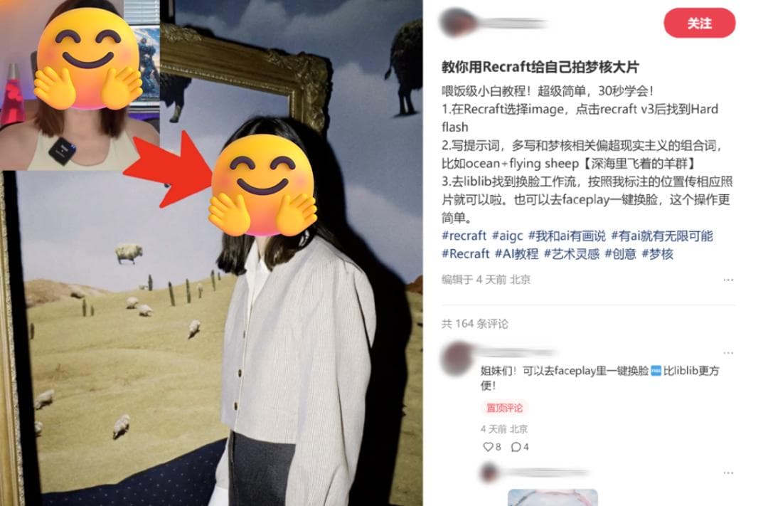 “先在Recraft输入一些梦核相关、超现实主义的组合词,生成一张带人像的胶片风图片,再换个AI软件一键换脸,质感大片就免费出炉。”小红书上不少帖子在教学如何用Recraft生成复古梦核写真。