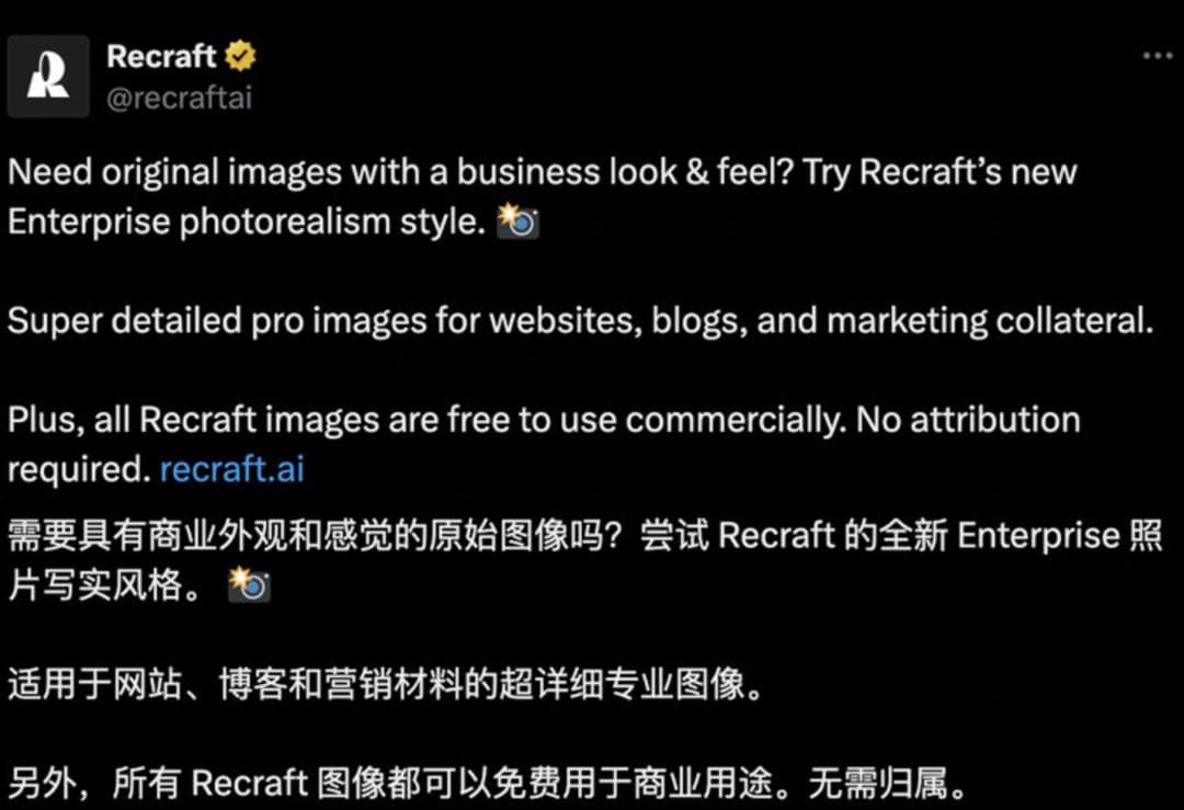 Recraft的解释是一方面声明“不会用被上传的艺术家作品训练模型”,另一方面表示“责任在用户”:因为用户先提供风格关键词,所以生成风格是用户的行为。