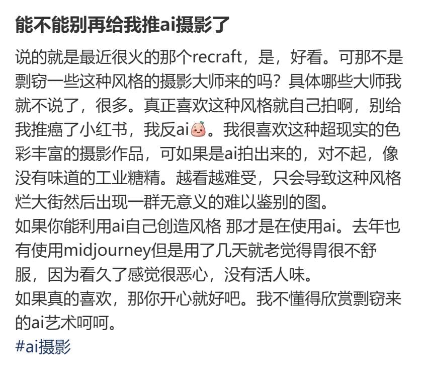 另一方面,AI生图尚未取代摄影最核心的功用——它还不能承载人类的回忆和情感。就像小红书上网友评论所说,“生成一张本不存在的照片,即使看到也不会给人以触动。”
