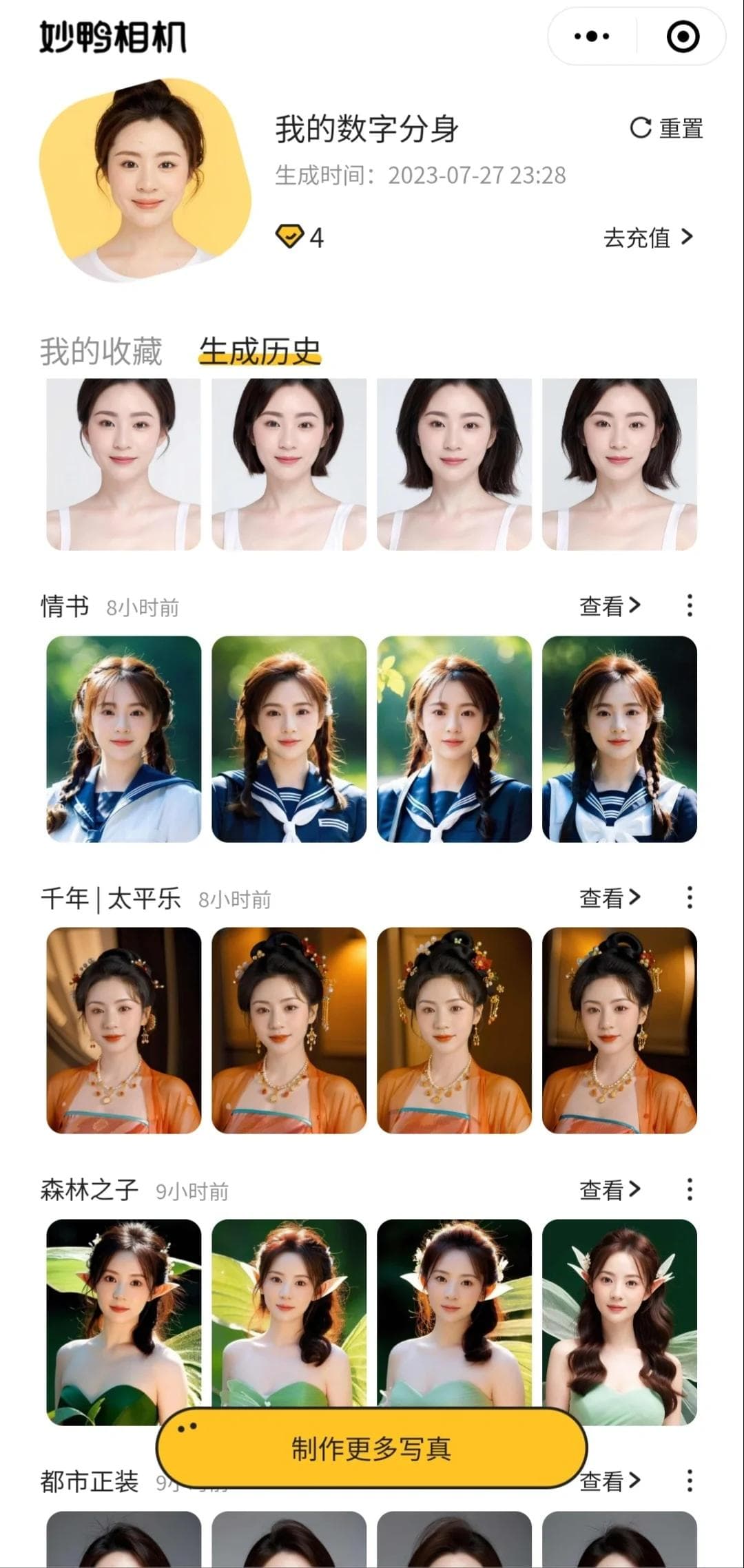 没人知道打工人们用Recraft自产头像的新鲜劲儿还能持续多久。毕竟在它之前,国内已不知道涌起过多少波AI生图潮,比如中国市场上第一个破圈的消费级人工智能产品“妙鸭相机”,在一年前凭借“仅需9.9生成高质量写真”的口号,席卷了几乎所有社交平台。
