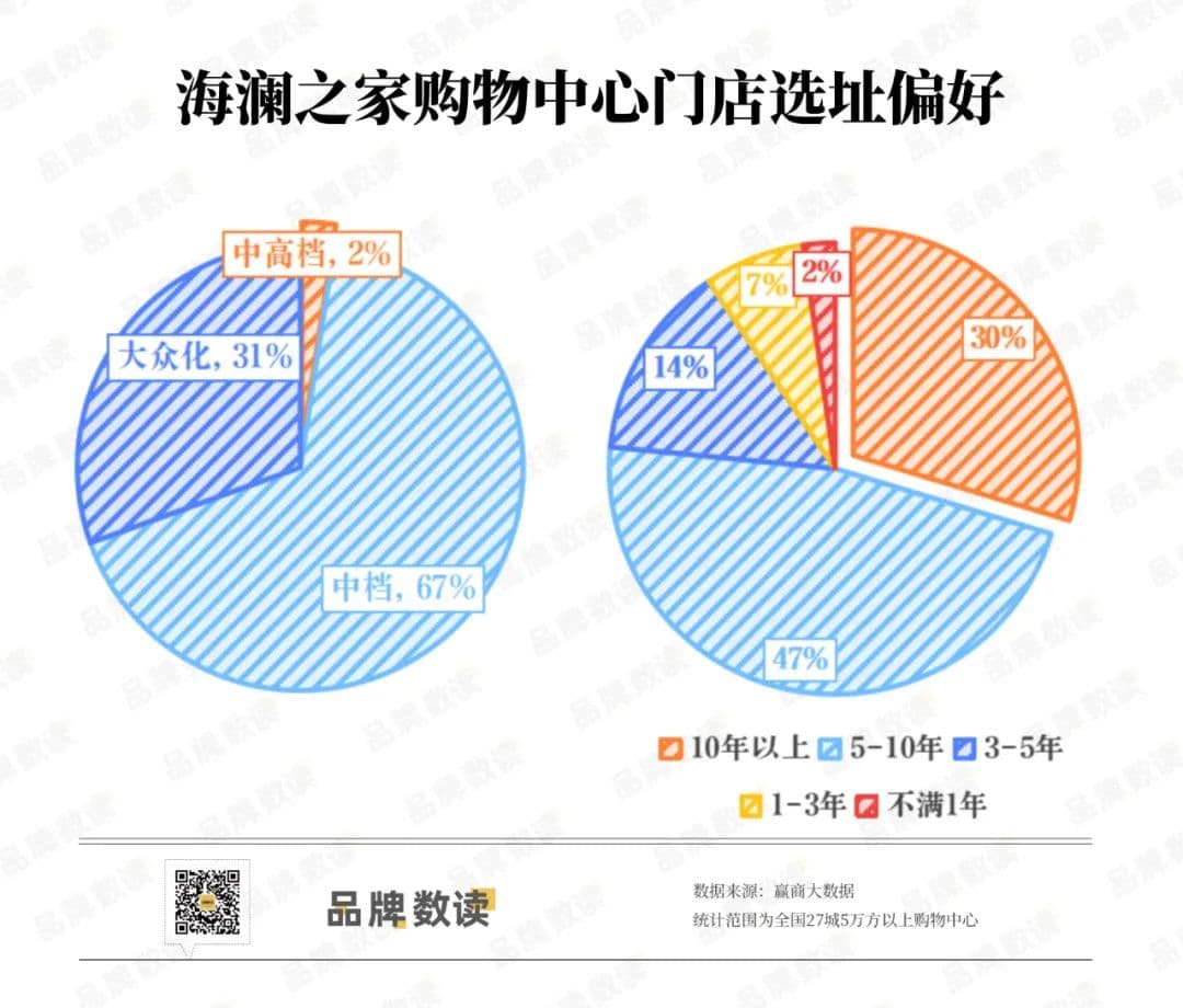 赢商大数据显示,在全国27城5万方以上购物中心中,海澜之家旗下仅有2%的门店进驻了中高档购物中心,67%的门店分布在中档购物中心,还有31%的门店进驻大众化项目。