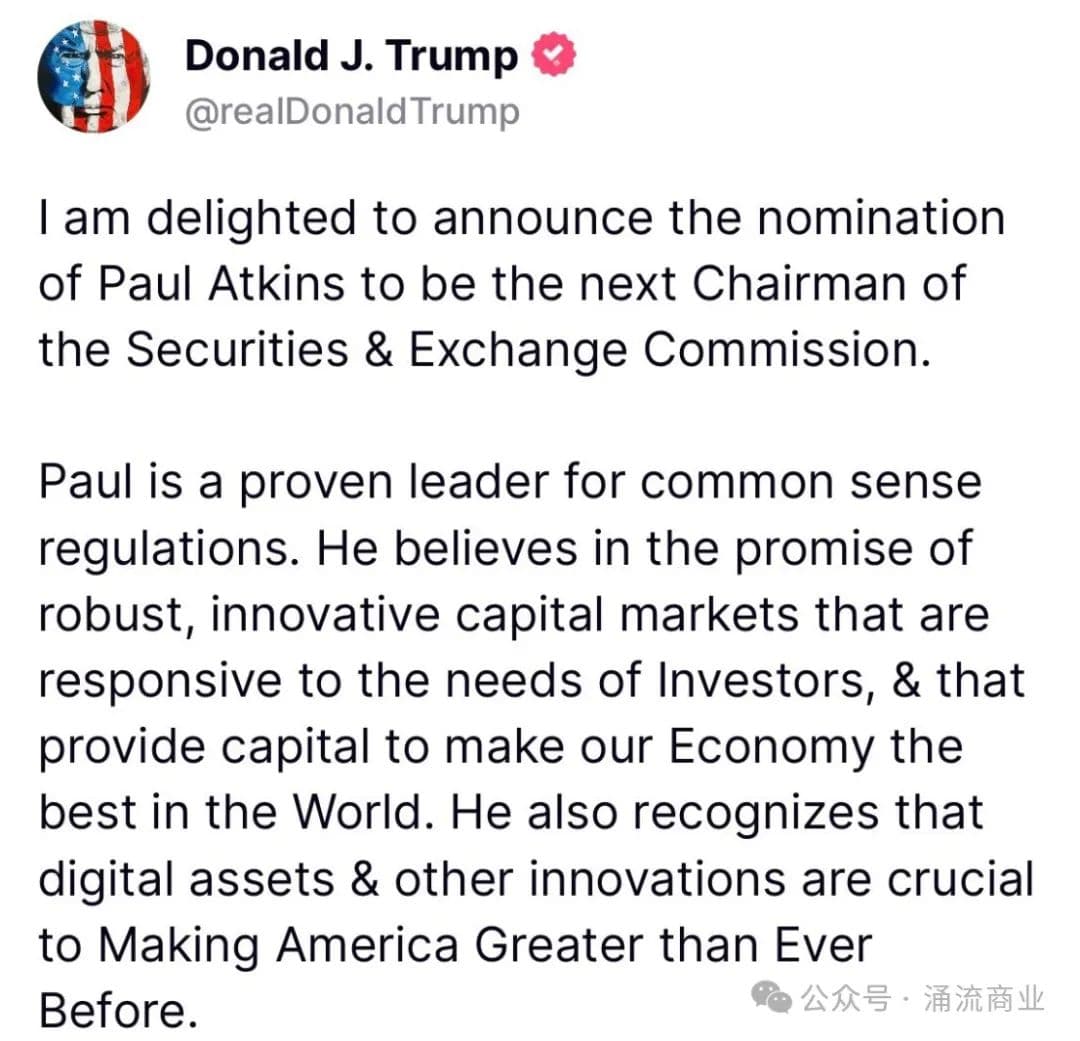 12月4日,加密货币倡导者保罗·阿特金斯(Paul Atkins)被提名为美国证券交易委员会(SEC)主席,推动了加密货币反弹。