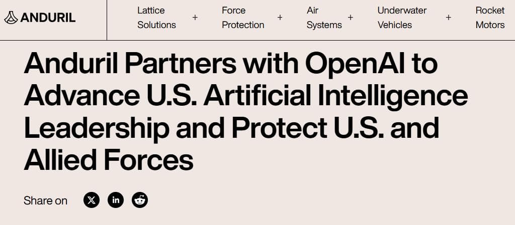 Anduril Industries联合创始人兼首席执行官Brian Schimpf表示,“Anduril打造的国防解决方案可满足美国及其盟军的紧急作战需求。与OpenAI的合作将使我们能够利用他们在人工智能领域的世界级专业知识,来解决全球紧张的防空能力缺口。我们共同致力于开发负责任的解决方案,使军事和情报人员能够在高压情况下做出更快、更准确的决策。”