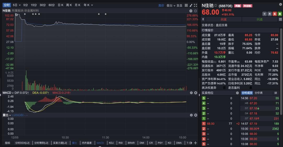 佳驰科技发行价格27.08元/股,今日首发上市以85.25元开盘,截至收盘涨幅达151.11%,最终报收68.00元/股。