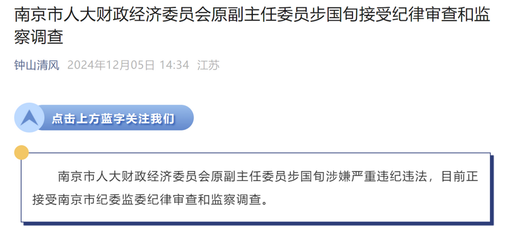 财联社12月6日讯(记者 陈俊兰 王晨)12月5日,中共南京市纪律检查委员会、南京市监察委员会在官方公众号“钟山清风”发布消息称,南京市人大财政经济委员会原副主任委员步国旬涉嫌严重违纪违法,目前正接受南京市纪委监委纪律审查和监察调查。值得一提的是,此次被查,距离步国旬退休已有3年时间。