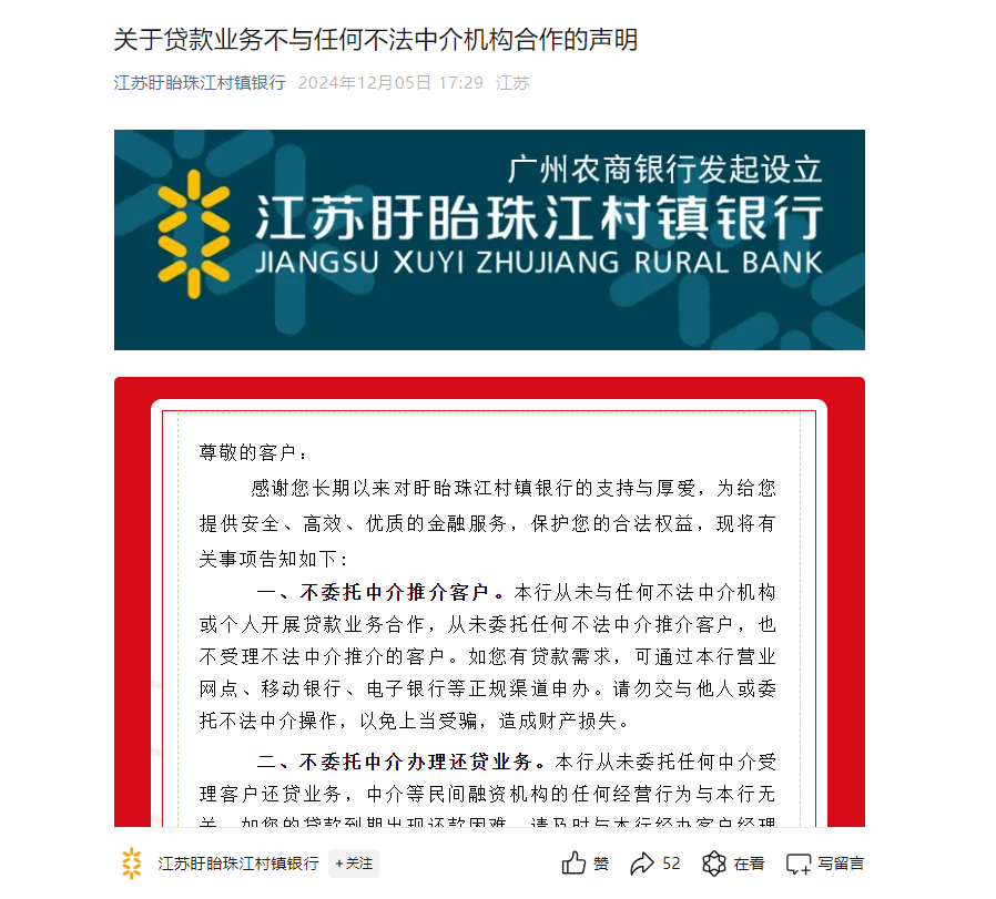 江苏盱眙珠江村镇银行昨日晚间也发文表示,贷款业务不与任何不法中介机构合作。该行表示,该行从未与任何不法中介机构或个人开展贷款业务合作,从未委托任何不法中介推介客户,也不受理不法中介推介的客户。该行从未委托任何第三方收取办贷费用。