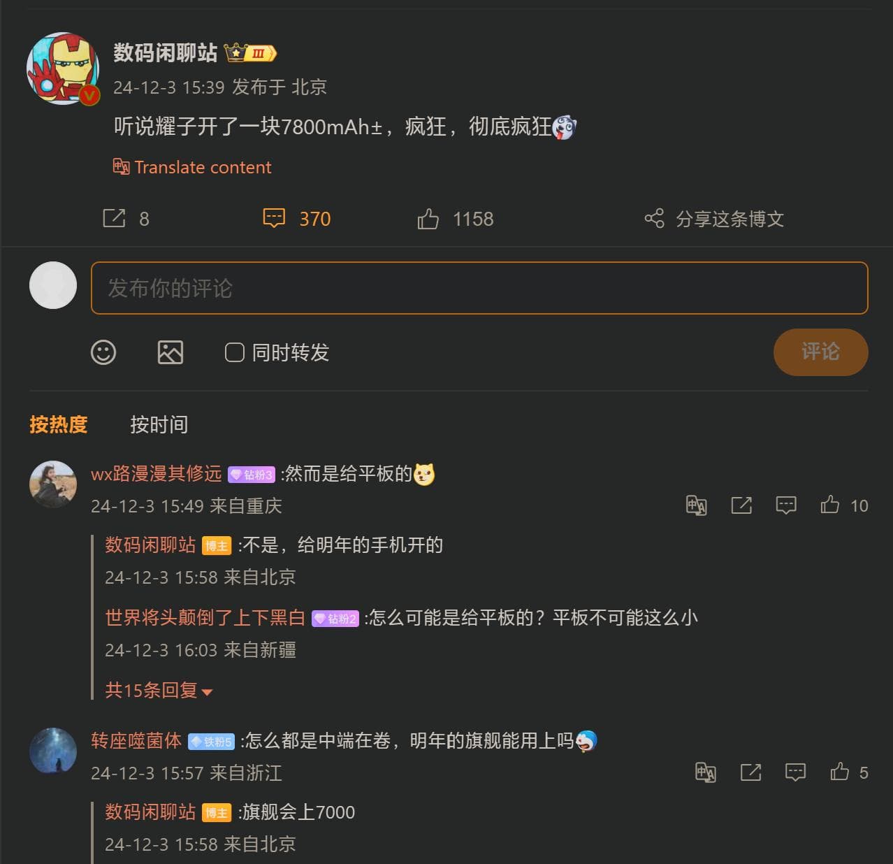 另一方面,知名爆料博主@数码闲聊站还透露,荣耀计划在明年的一款新机上搭载 7800mAh 大电池,旗舰机也会上 7000mAh。事实与否暂不确定,可以确实可以大胆推测,至少 7000mAh 不是主流手机的终点。