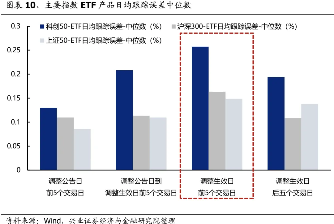 实际上,ETF基金为了能够及时根据指数样本调整持仓、减小跟踪误差,同时又要减少集中调仓对股价造成的冲击影响,多会选择在指数调整正式生效前进行部分调仓,尤其是对于受调仓潜在冲击较大的公司,因而对股价的影响出现前置。从主要指数ETF产品的跟踪误差上也能够观察到,由于提前调仓,在调整公告日到调整生效日期间ETF跟踪误差通常会出现抬升,其中在调整生效前5个交易日内跟踪误差最为明显,而在调整生效后则会回归到常态水平。
