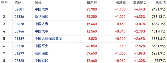 截至发稿,新华保险(01336.HK)、中国太保(02601.HK)双双涨超4%,中国人寿(02628.HK)涨逾3%,中国平安(02318.HK)、中国太平(00966.HK)等险企也纷纷跟涨。