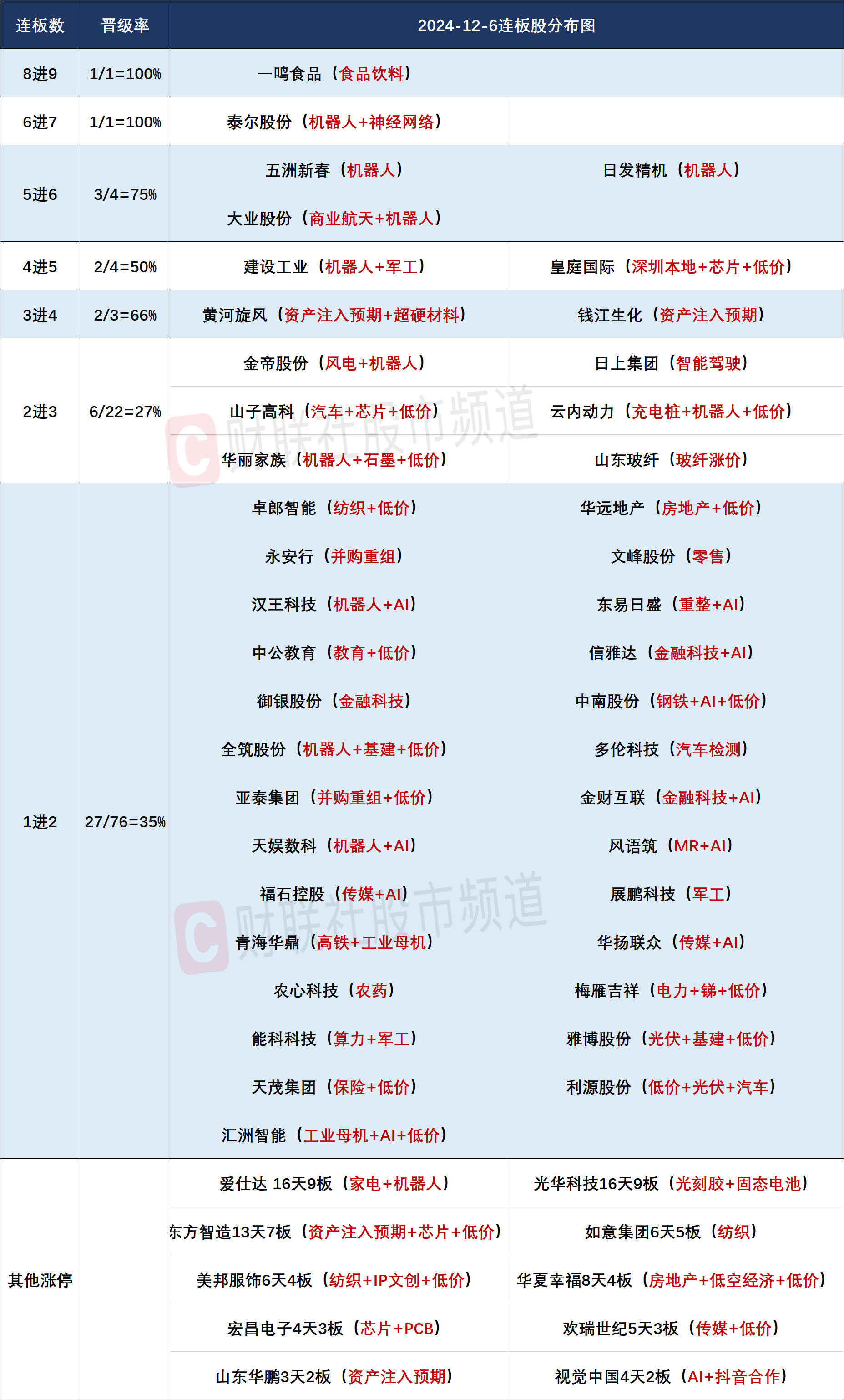财联社12月6日讯,今日121股涨停,55股炸板,封板率为69%,一鸣食品9连板,泰尔股份7连板,五洲新春、大业股份、日发精机6连板,皇庭国际、建设工业5连板,钱江生化4连板,爱仕达、光华科技16天9板,日上集团8天7板,东方智造13天7板,如意集团6天5板,黄河旋风8天5板,云内动力、东易日盛、山子高科5天4板,美邦服饰6天4板,华夏幸福8天4板,江南高纤9天4板。沪深两市全天成交额1.79万亿,较上个交易日放量2902亿。短线情绪继续活跃,全市场超3600只个股上涨,逾百股涨停或涨超10%。板块方面,保险、文化传媒、Sora概念、CRO等板块涨幅居前,汽车零部件、光伏设备、供销社、飞行汽车等板块跌幅居前。截至收盘,沪指涨1.05%,深成指涨1.47%,创业板指涨2.05%。