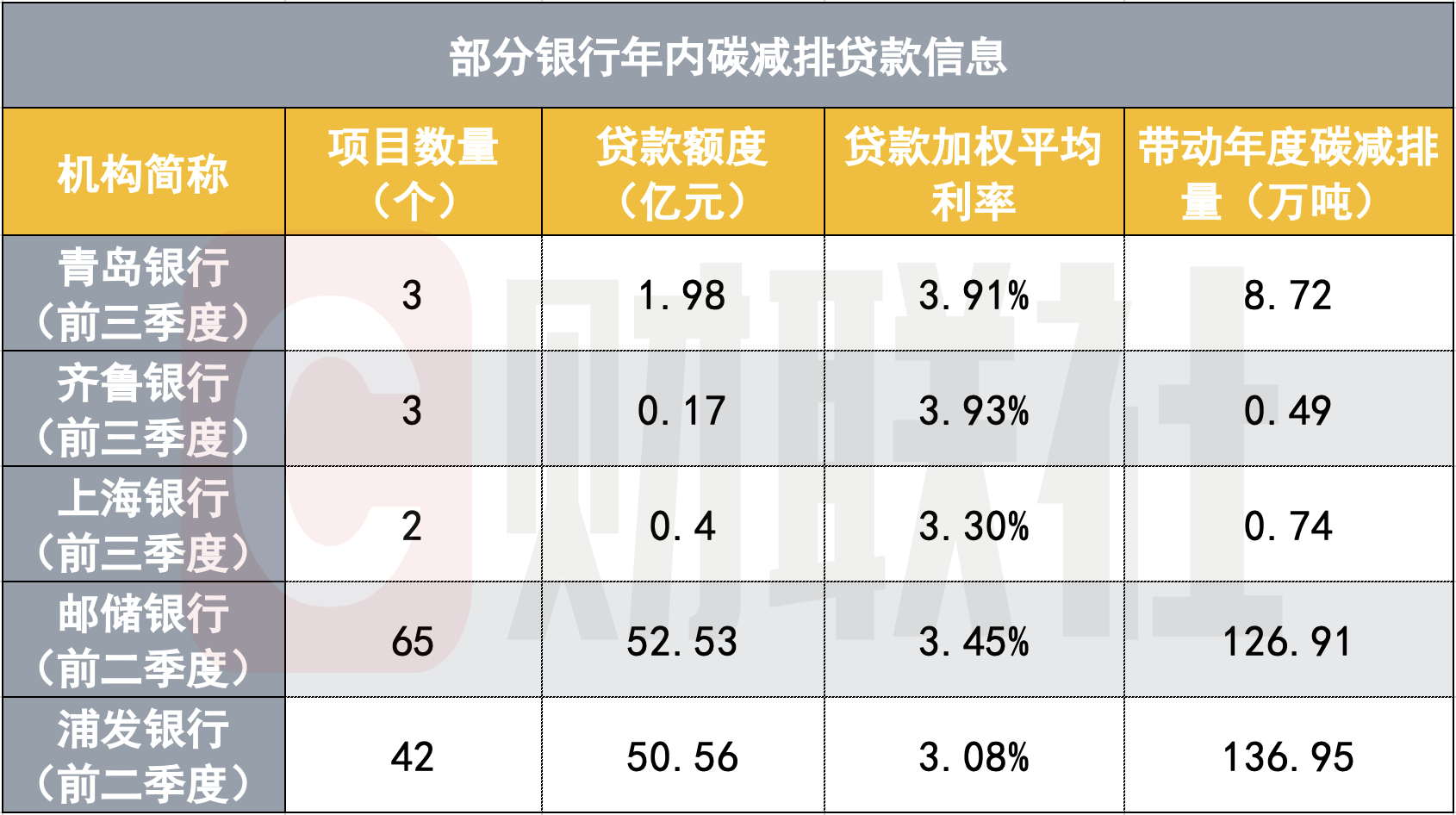 从投放情况来看,上述各家银行参与碳减排项目数量及贷款投放规模各有不同,但相对而言,国有银行、股份行碳减排项目投放力度明显更大。其中,上半年邮储银行累计向65个项目发放碳减排贷款52.53亿元,浦发银行累计向42个项目发放碳减排贷款50.56亿元。