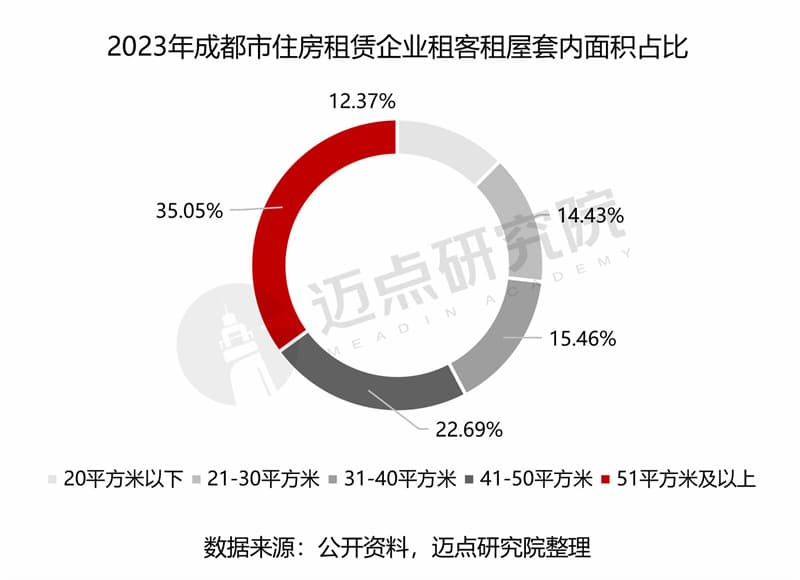 据调查数据显示,在一线和新一线城市中,成都位于宜居城市前列。住房租赁企业租客租屋面积在51平方米以上的占比最高,为35.05%;其次为41-50平方米,占比22.69%;40平方米及以下占比合计42.26%,其中几乎没有10平方米以下的户型。对比其他城市,占比最高的区间为21-30平方米,杭州与广州10平方米以内的占比超15%。总体来看,成都市对租客较为友好,租住面积在40平方米以上的比例领先其他城市。