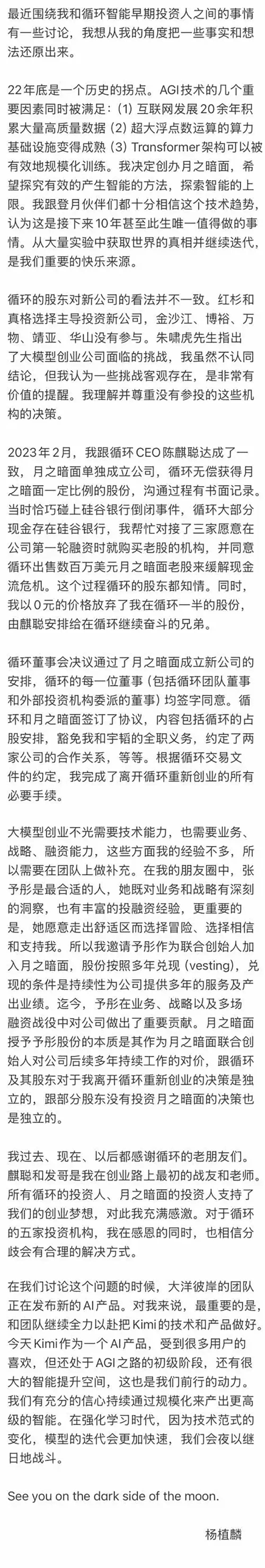 1、月之暗面单独成立公司,在2023年2月已跟循环智能CEO陈麒聪达成了一致,循环无偿获得月之暗面一定比例的股份,沟通过程有书面记录。