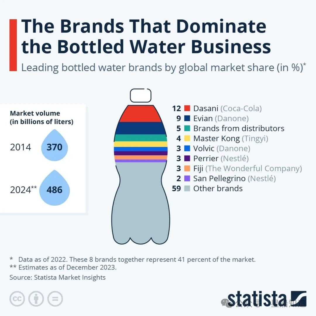 可口可乐的Dasani瓶装水、雀巢旗下的巴黎水和圣培露,达能旗下的依云和富维克、斐济、康师傅等。