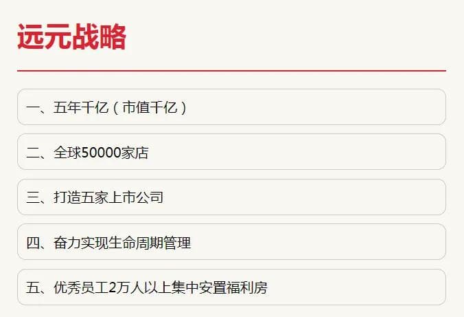 但郑远元明显想走得更远,一组数据暴露了郑远元更大的野心——未来5年内要突破千亿市值,在全球开出50000家门店,打造5家上市公司。