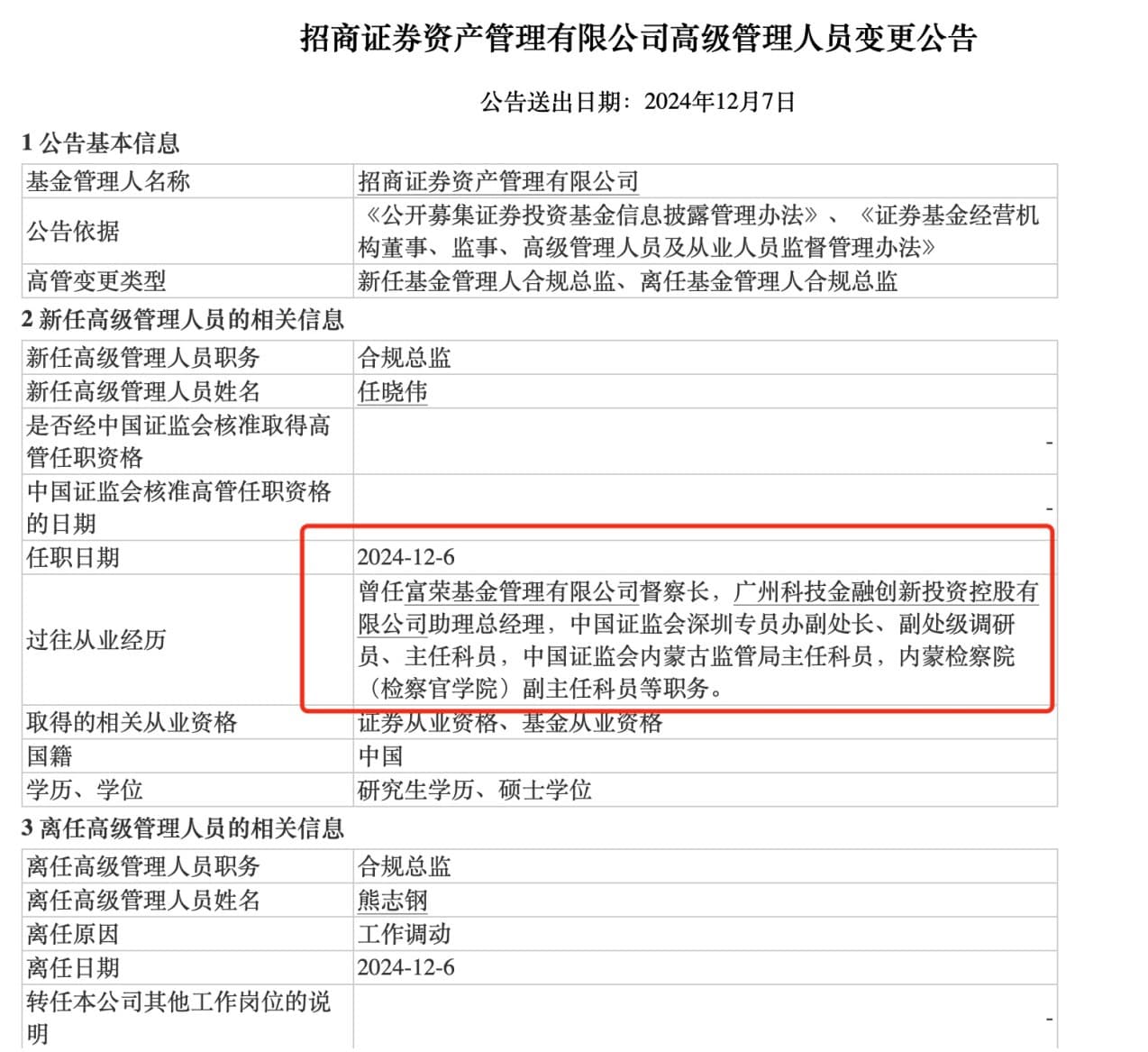12月7日,招商资管发布高级管理人员变更公告称,原本兼任合规总监的副董事长熊志钢因工作调动,不再担任合规总监一职,由任晓伟接任。