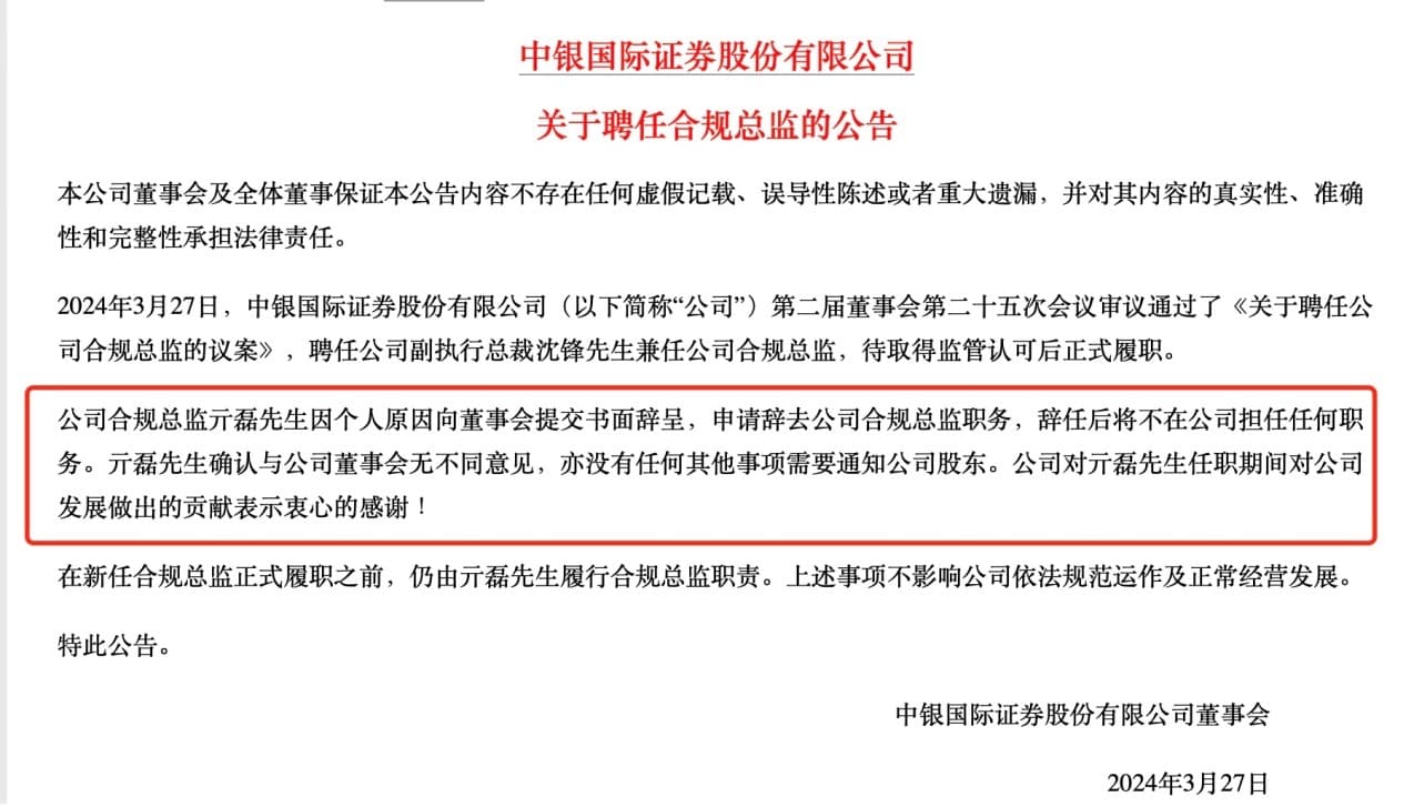事实上,早在今年3月27日,中银国际证券曾经公告过合规总监的变更。公告显示,亓磊因个人原因向董事会提交了辞去公司合规总监职务的书面辞呈,辞任后,亓磊将不再担任公司任何职务,公司对亓磊在任期间对公司发展做出的贡献表示衷心的感谢。