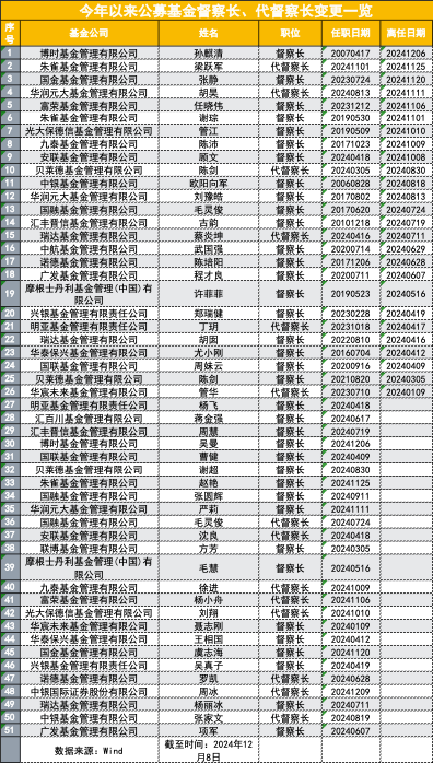 今年以来,系列政策释放出强监管信号,在这一背景下,券商合规、公募督察长等角色变得更为重要。财联社记者不完全统计显示,截至12月8日,年内已有25家公募基金公司发布了51次督察长、代督察长变更公告,其中,中小基金公司合规负责人变更更为频繁。