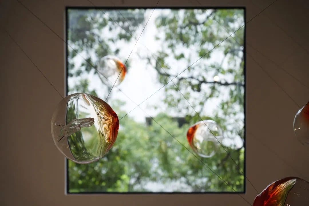 我用玻璃就像是“给空气描边”,在荷花池的岸上立了一个3米高玻璃立柱,里面是互相挤压形变的几个大玻璃泡,仿佛空气在密闭空间里的胶着状态。荷花池里有很多游鱼、青蛙,我做了一个浮在水面,有呼吸、沸腾感觉的玻璃泡泡装置。