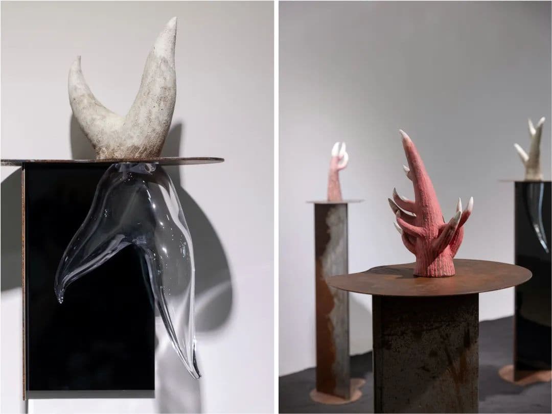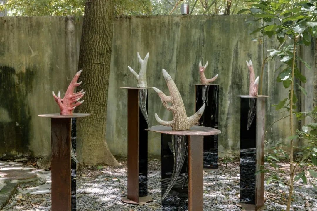 这七组雕塑里,上半部分是陶瓷做的,有很粗粝的表面肌理,模拟公鹿的角和树根,但故意做成粉红色,看起来很像珊瑚。底座是一块呈90度角的做锈的生铁,映照往下伸出的一根玻璃角,它像陶瓷的镜像,也像个幽灵。