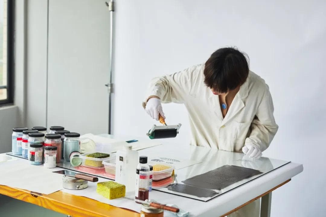 谢文蒂在做玻璃版画