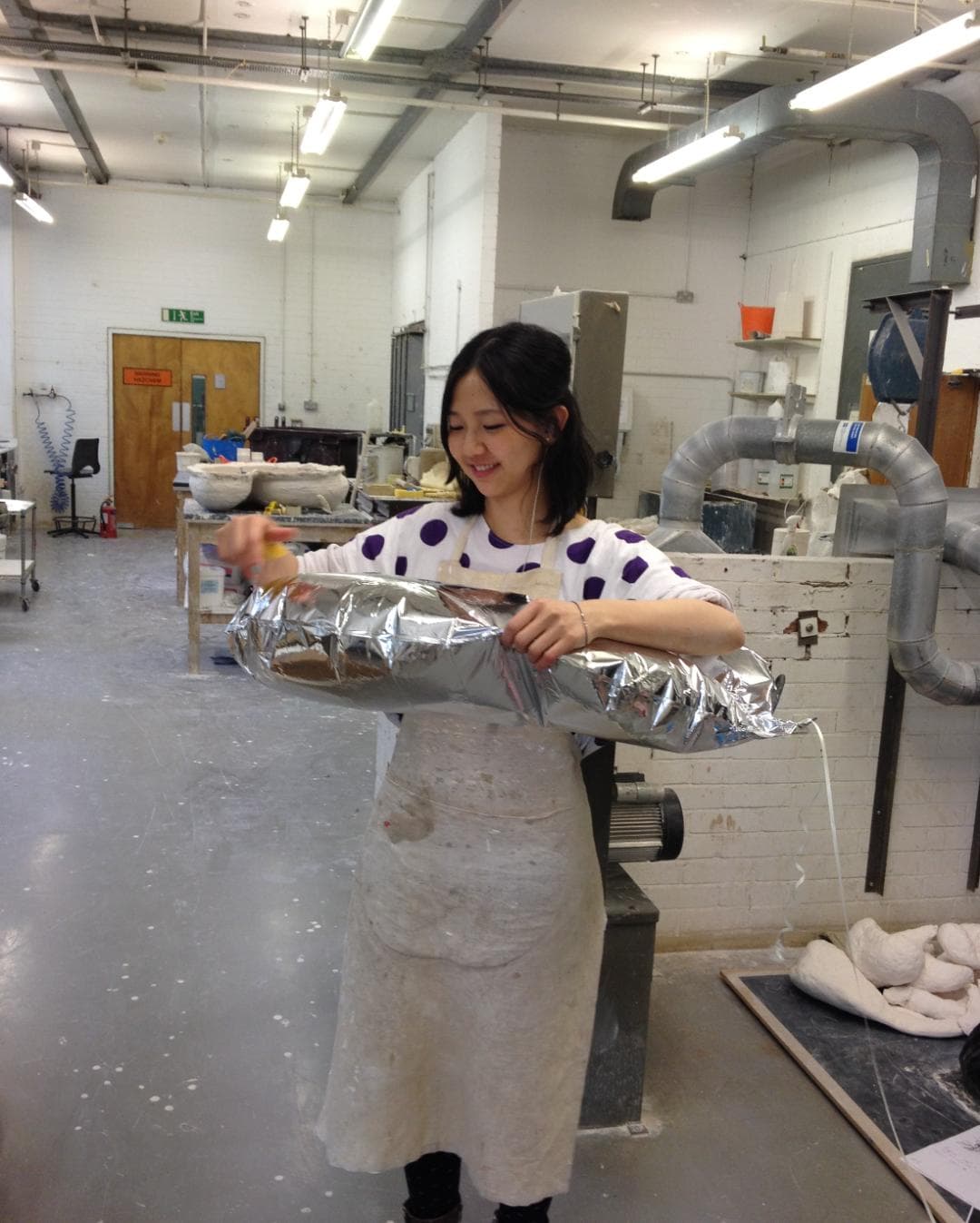 工厂深处,一张污迹斑斑的木板搭出来的桌子上,摆着几件她刚翻好的模具。创作时她总套上一件白大褂,已经穿到发黄,看上去很像一个实验室研究员。