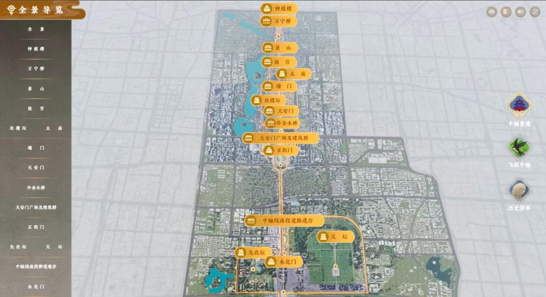 依托数字孪生技术打造的北京中轴线在线观览,可以选择不同地点、年代进行参观丨北京中轴线官方网站