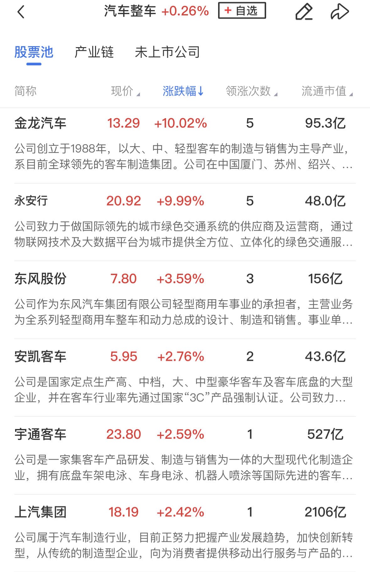 汽车整车概念股同样相对活跃,金龙汽车涨停,东方股份、安凯客车、宇通客车、上汽集团、赛力斯等个股跟涨。消息面上,中国汽车流通协会方面表示,本轮报废更新及以旧换新政策将在12月底结束,加之春节提前至1月份,预计12月汽车市场翘尾行情较为突出。