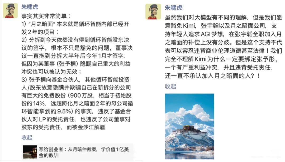 最近两天,月之暗面的仲裁纠纷持续发酵。金沙江创投主管合伙人朱啸虎公开“炮轰”前金沙江创投主管合伙人张予彤,认为其隐瞒在月之暗面的股权激励,并指出月之暗面在拿到循环智能几个投资方的同意豁免书之前开始融资,次程序过程存在问题,对月之暗面的豁免协议也可以被认为无效。