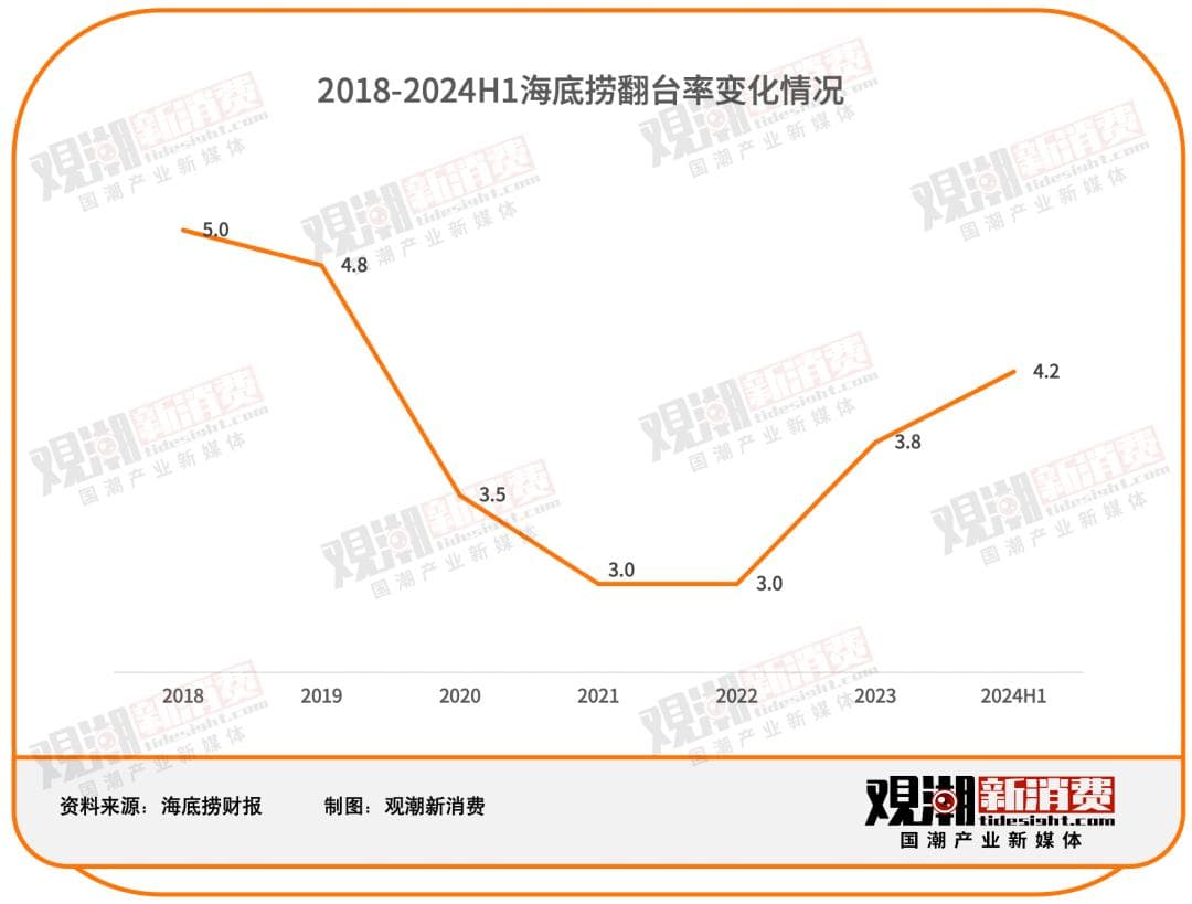 直至今日,海底捞的啄木鸟计划成效初显,2024年上半年的翻台率增长至4.2次/天,已经达成当初定下的目标。 但从财报来看,翻台率的增长似乎并不意味着业绩的回暖。