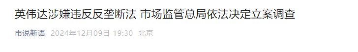 近日,因英伟达公司涉嫌违反《中华人民共和国反垄断法》及《市场监管总局关于附加限制性条件批准英伟达公司收购迈络思科技有限公司股权案反垄断审查决定的公告》(市场监管总局公告〔2020〕第16号),市场监管总局依法对英伟达公司开展立案调查。