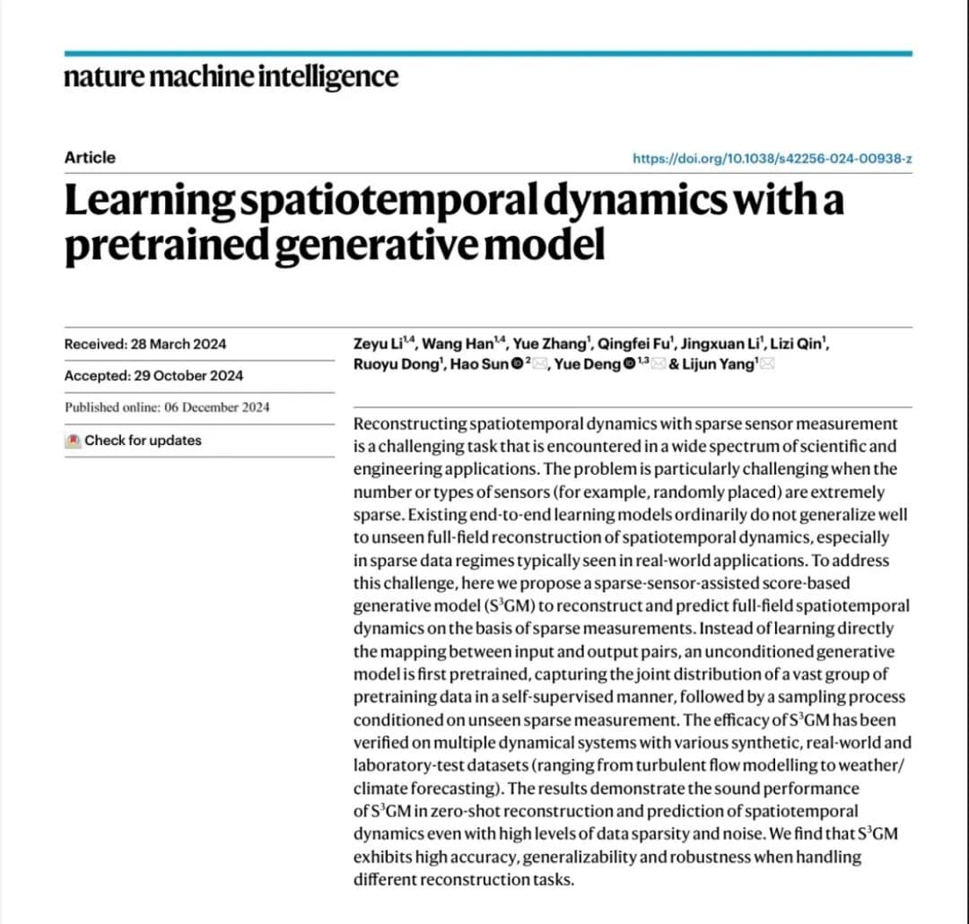 中国人民大学高瓴人工智能学院长聘副教授孙浩团队与北京航空航天大学杨立军教授团队合作,近日在Nature子刊Nature Machine Intelligence(《自然-机器智能》)发表题为“Learning spatiotemporal dynamics with a pretrained generative model”的文章,提出了一种基于扩散生成模型的动态系统预测算法,称为S3GM (Sparse-Sensor-assisted Score-based Generative Model)。