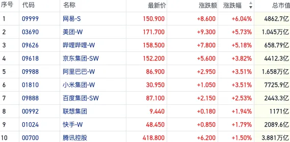 科技股方面,网易涨约6%,美团涨超5%,京东涨近4%,小米、阿里巴巴涨逾3%,百度、快手、腾讯均飘红。