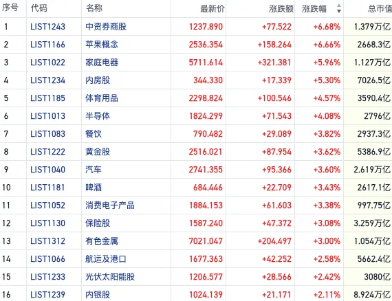 其他热点方面,券商股领跑大金融板块,招商证券大涨13.65%,保险股跟涨。此外,内房股明显拉升,苹果概念、航空股、生物医药、半导体板块纷纷上涨。