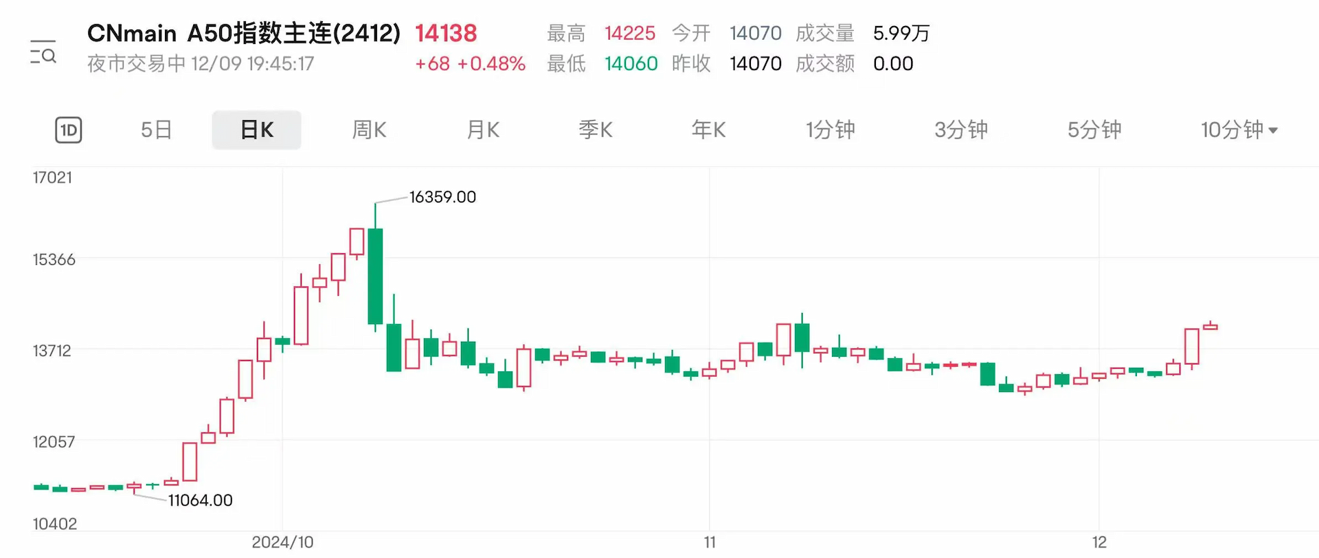 截至发稿,富时A50期货主连突破14000点整数关口,但距离10月8日的16359点的高点仍有距离。短线港A两市的反弹高度也值得关注。