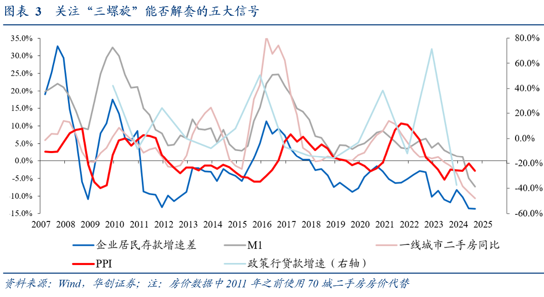 经济的验证方面,我们依然坚持五大领先指标法——按时间排序为财政发力、企业居民存款增速差、M1、一线城市二手房房价同比、PPI同比。