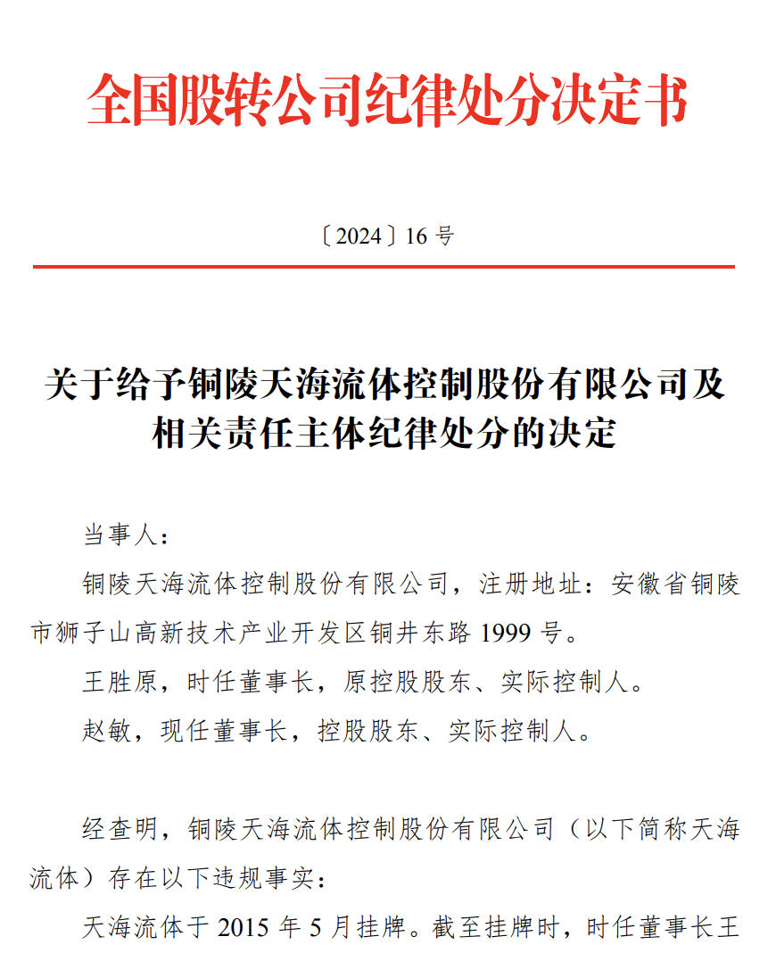 根据官网披露,全国股转公司于今年4月29日对先前在新三板挂牌企业天海流体作出公开谴责。从主要违规事项来看,天海流体主要是在挂牌时存在股份代持,未如实披露公司控股股东、实际控制人及公司历史沿革,并违反了多项相关规定。