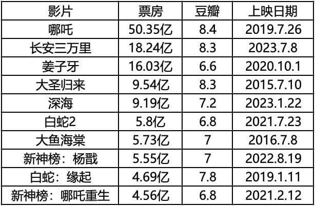 (内地动画票房TOP10,榜单未包含《熊出没》系列)
