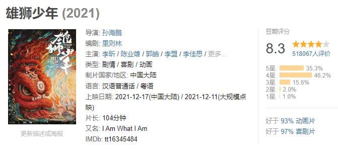 唯一的安慰在于,即便面对如此级别的抹黑,《雄狮少年》在口碑方面没有崩塌,豆瓣至今保持在8.3的高分,足以证明它在内容端有多么的优秀。包括猫眼的9.4、淘票票的9.2,都证明了只要是买票观看的观众,始终对它是有一个非常正面的评价,《雄狮少年》是一部被严重“误伤”的电影。