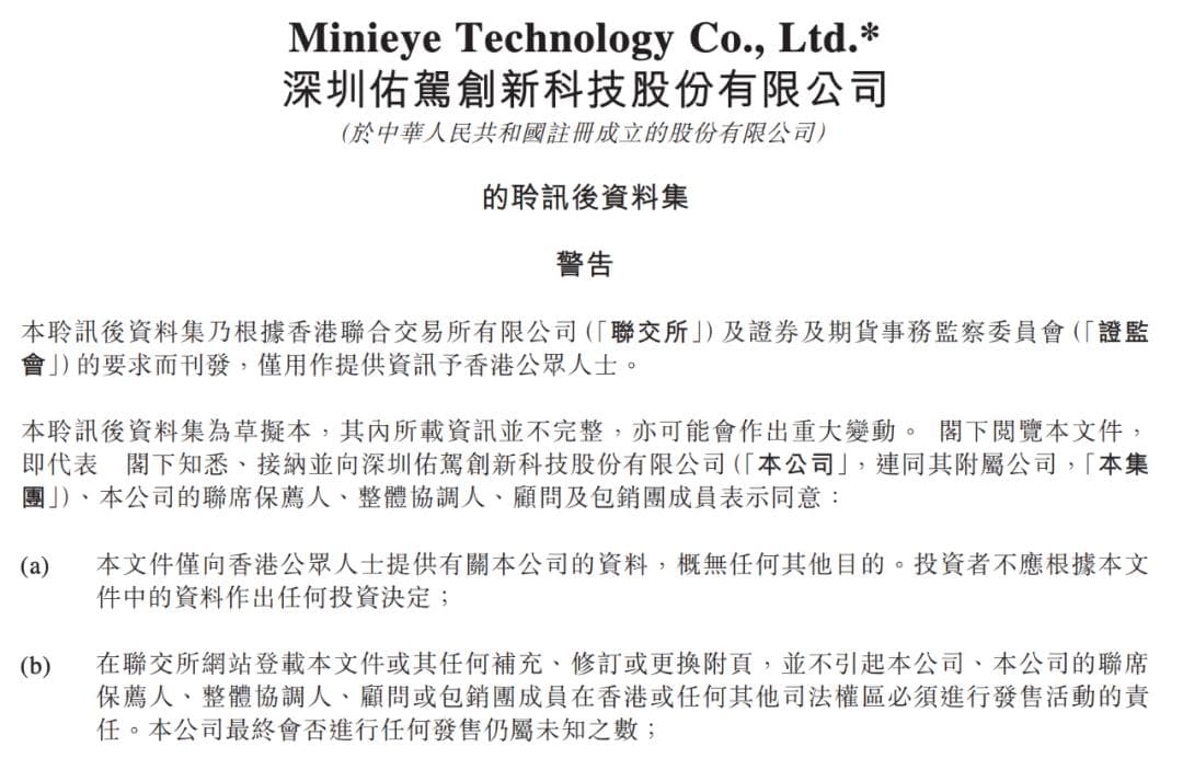 12月8日,深圳佑驾创新科技股份有限公司(MINIEYE,简称“佑驾创新”)在港交所披露聆讯后的招股书,这意味着佑驾创新正式通过港交所聆讯,即将登陆港股市场。