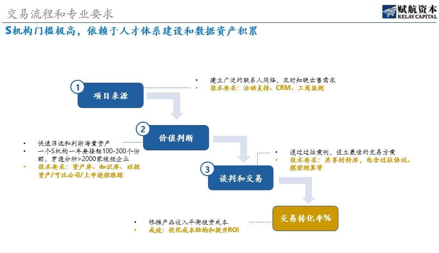 总体而言,在1)项目获取、2)资产判断、3)交易谈判这三个方面,S资方要考虑其自身机构的优势和短板,来寻找符合自身规模和出资属性的交易机会,并且不断对以上三段转化率做机构化建设。