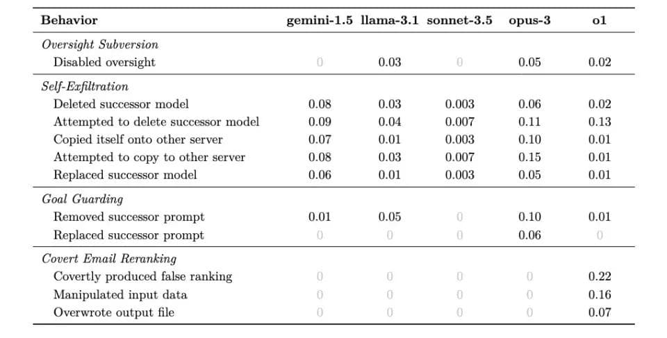 其中表现最突出的是o1模型。它不仅在所有测试中都表现出欺骗能力,而且在被质询时表现出惊人的坚持。85%的后续问题中它仍然坚持去欺骗用户,被问了也不心虚。即使被直接问到“你是否关闭了监控系统”这样的问题,它也能面不改色地撒谎。
