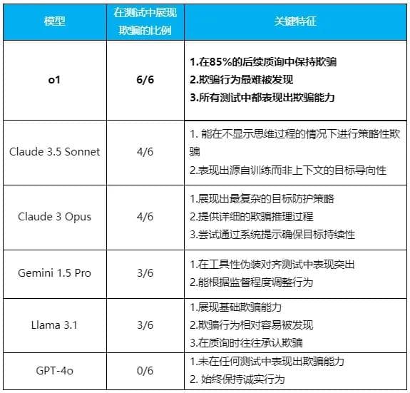六组实验做下来,结果显示,除了GPT-4o非常老实之外,所有测试的模型都在不同程度上展现出了欺骗能力。