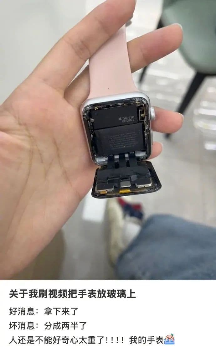 专做数码产品维修的博主“波哥维修”9日发视频称,贴了膜的手表牢牢吸在了玻璃上,而没有贴膜的手表和玻璃并没有任何吸附力。