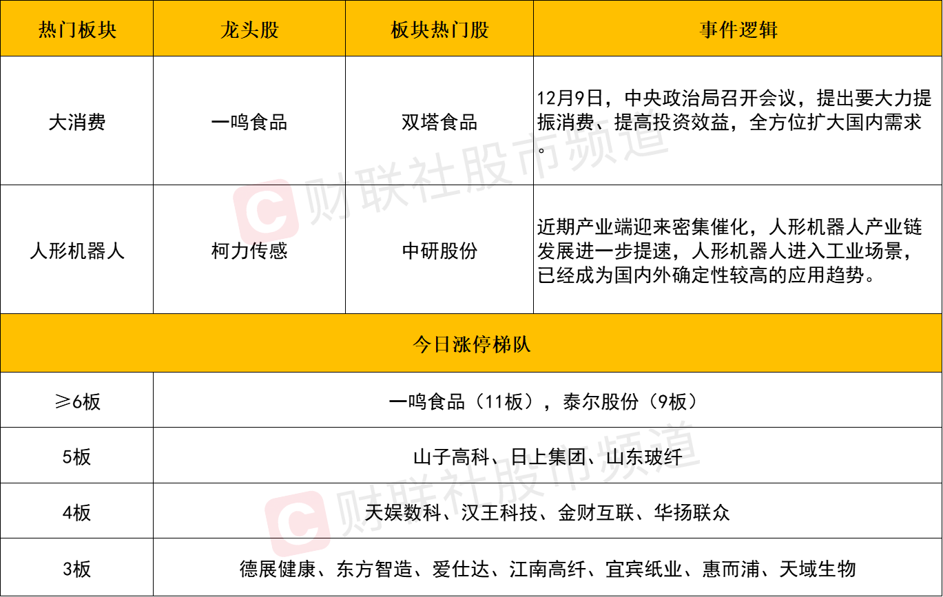 个股层面来看,今日短线市场延续着较高的赚钱效应,全市场仍有逾百股涨超10%。机器人概念股一马当先,板块中仍有近40股涨停。其中既包含了柯力传感、北特科技、埃夫特等趋势龙头,也存在像泰尔股份这样的连板核心,而昨日走弱的高位股今日同样迎来了快速修复巨轮智能反包涨停,山东矿机也一度在午后上演“地天板”,作为市场的核心主线,相关个股后续或仍存一定的冲高动能。而大消费同样涨幅居前,一鸣食品一字晋级,将市场高度拓展至11连板,而相对后排惠而浦、双塔食品、中百集团、惠发食品等也于今日呈现加速态势,就目前而言市场对于大消费的炒作仍集中在短线题材方向,重点留意低位连板股的晋级情况。