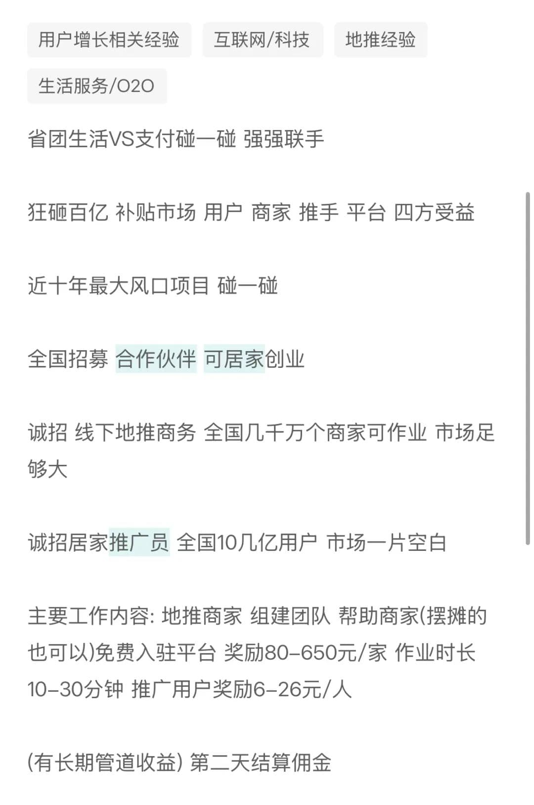 随机点开一条信息查看,可以看到这些招聘岗位的主要工作内容为地推商家、组建团队、帮助商家免费入驻平台,奖励80-640元/每家,作业时长10-30分钟等等。