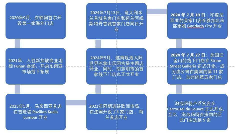 泡泡玛特从第一家海外门店落地(20年9月韩国首尔),中间因疫情耽误到2022年才真正意义上比较快地海外铺店,而到了2024年,两年时间内,它已经全面爆发。