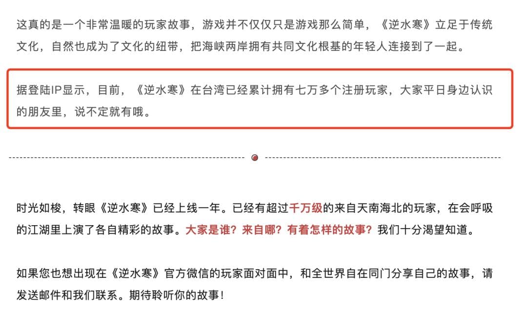其二,《逆水寒》本身在台湾市场就有一定的受众基底。根据《逆水寒》公众号统计的数据来看,早在2019年,《逆水寒》端游在台湾市场已经累计拥有七万多个注册玩家。这个数据,给《逆水寒》手游在港澳台市场的上线提供了一定的数据保证。