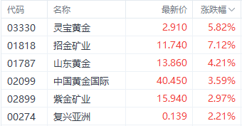 财联社12月11日讯(编辑 胡家荣)受益于隔夜现货黄金突破2700美元大关,港股黄金股走强。截至发稿,招金矿业(01818.HK)、灵宝黄金(03330.HK)、山东黄金(01787.HK)分别上涨7.12%、5.82%、4.21%。