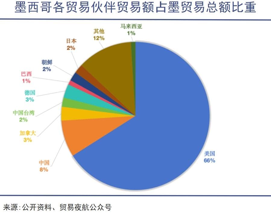 墨西哥国内80%的投资来自美国,而本国80%的商品(4756亿美元)出口至美国,其中出口美国的汽车占出口总量的75%以上。在墨西哥的贸易总额中,美国一家就占了66%。